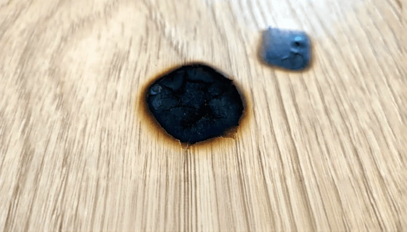 Deutlicher Brandschaden auf einer Holzoberfläche mit verkohlter Stelle.