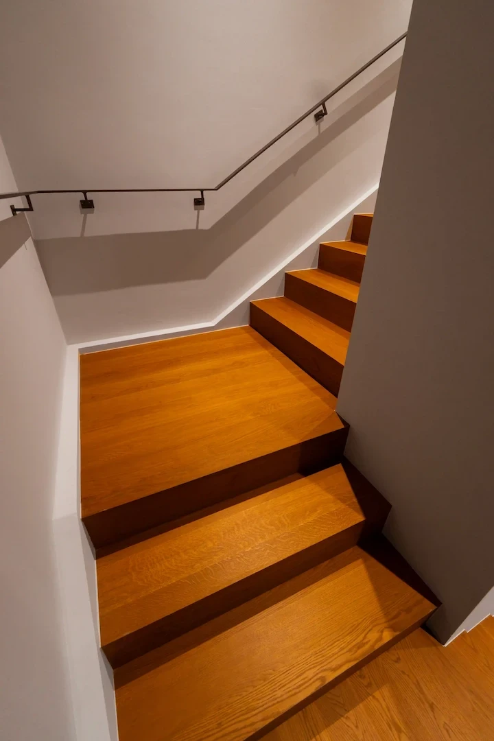 Hochwertig renovierte Holztreppe mit warmem Holzton und indirekter Beleuchtung in modernem Innenraum